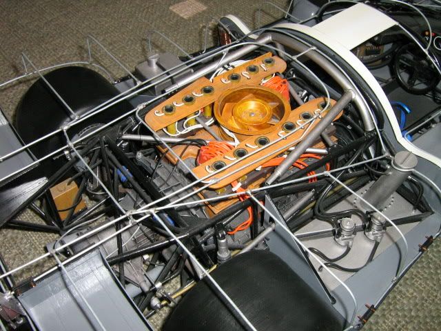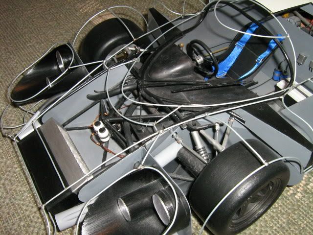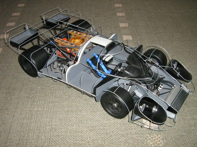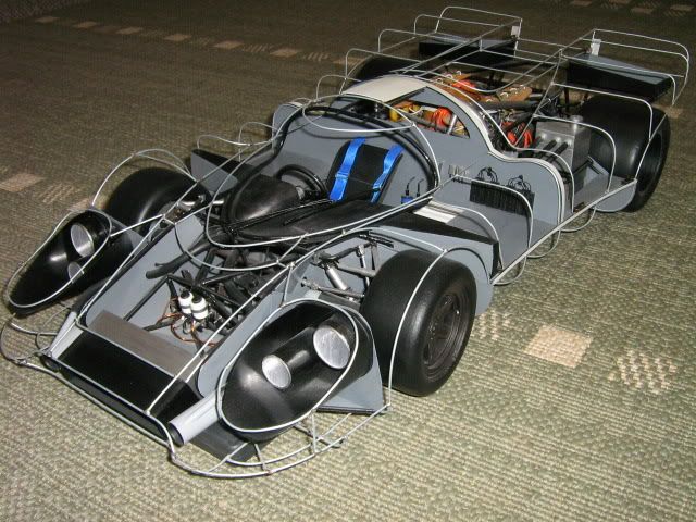 Okay - I promise this is the last completed 1/8 scratch-built you'll see from me until the current 908/03 is finished! This was my first non-Formula Ford project, and where my enthusiasm for their 1970's sports-racers began - a Porsche 917K. Built between June 2004 and June 2006, it was about 1300 hours of work (I kept a record...) and quite a learning process. Everything about it was bigger and more complicated than on my previous projects, so I had to adjust my methods and techniques accordingly. ![]() ![]() ![]() ![]() For the first half of the build I wasn't sure how I was going to tackle the bodywork - at this point I had no experience of working with fibreglass. I made a foam / filler buck (which took about 90 hours alone) and tried various non-fibreglass methods (plasticard, thin cardboard, etc), none of which worked. Making the outline of the bodywork from soldered-together wire, however, solved the problem - the detail beneath the skin is what makes these cars so interesting, and it seemed a shame to have it hidden away. After making the 917-10, I think a full fibreglass shell is a possibility, but that then creates the problem of how to mould the screen and headlight covers, etc... ![]() ![]() ![]() ![]() As with all my other cars, it's a mixture of plastic tube of various sizes, strip, sheet, wire, RC-car wheels (modified), etc. The extra roll-hoop at the front of the engine bay is made from a length of race-car fire-extinguisher hose: it's plastic-coated with a metal core which allows it to bend and hold a shape - perfect! The main suspension components are fully articulated using RC-car joints and scratch-built pivots - same as on the 917-10. On this one I didn't have to go overboard with the ribbing details on the brake calipers or gearbox casing - for 1969 and 1970 the originals didn't have so many as on the later cars. The brake discs weren't drilled, either, on the first cars. I had to fudge a few things as a result of the wire-body. For example, I had to create a partial structure behind the front wheels to finish off the cockpit interior, but in reality this would flow into the front bodywork section. Since making this one, there's been several really good 917 books released - most of which would have been ideal reference material had I had them at the time! There's plenty of things here I'd do differently now, but with these projects I just have to move on - I'm not sure I could do another 917 at the moment (unless there was a really good reason...) Anyway, I hope you like it. ScratchBuilt |