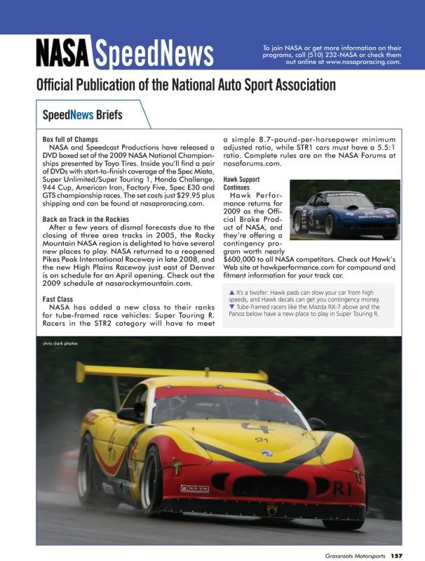 Along this topic. As Brian G. probably won't tell you: Guys take a look at this month's Grassroots Motorsports. May edition, page 157. Under the NASA Speed News you'll see a nice pic of Brian's car. Brian's carrying the banner for all of us!