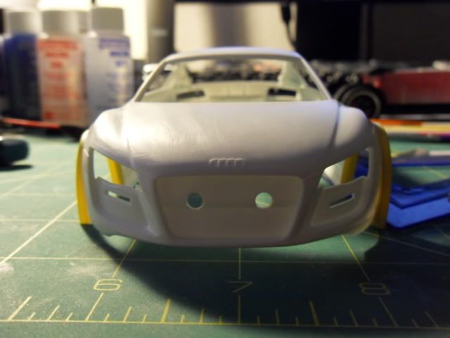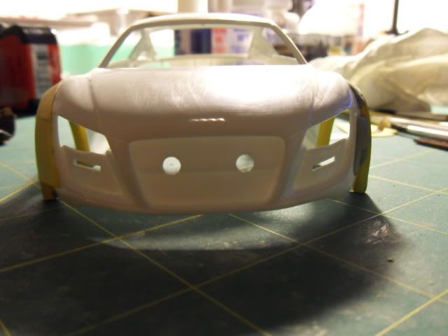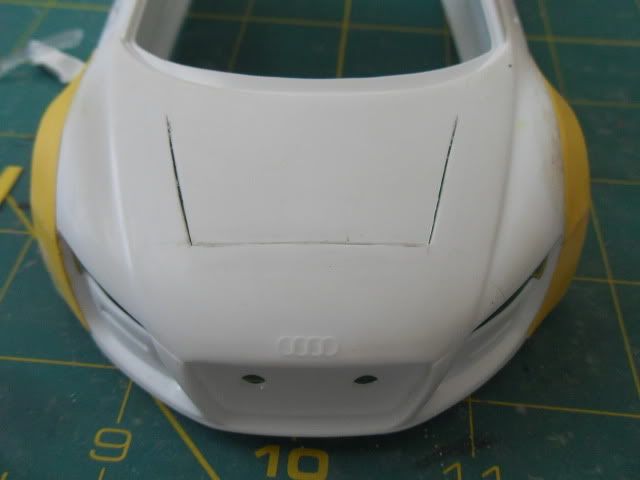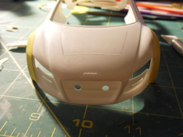 Looking good. Be sure to check fitment of the lens for the headlight before attaching it permanently. As for the hood. I would do one of two things. Either completely remove that section and re-attach it where it angles down just a bit for the effect that you are looking for. Or, Use some styrene or something as a spacer. Then carefully use a bit of heat followed by cold water to heat the back part of the vent, then use the cool water to help it retain its new position. USE EXTREME CAUTION, if you have any reservations or fears about using the heat DO NOT do it. You can quickly turn what is looking to be a great creation into a pile a goo in a matter of seconds.