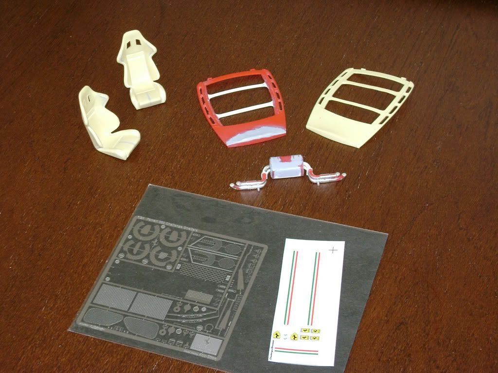 Thought I would post a thread on my current build to motivate me to finish it. Ive been working on this build for almost 3 years now, and plan to finish before Bathurst this year (started Bathurst 06) Ive seen others builds of this kit and have been inspired to finish (Awesome builds, Alex & Gio) This has been the biggest challenge (no pun intended) in my modeling career, first time using a resin transkit & stratchbuilding many parts (mainly because of crap molding by MSM) The Kit, Tamiyas excellant 360 Modena Transkit, MSM's very average 360 CS transkit (good basepoint) Misc, AcuStion Enzo photoetched brakes, AcuStion 360 CS Photoetch set SMS Carbon Fibre The Car ![]() Parts - Resin Seats reshaped to correct shape (look very similar to Tamiya Subaru WRC cars seats), Rear engine cover dosnt fit & is very warped, so I Modified Tamiyas piece ![]() Body with Resin Transkit ![]() ![]() Some Carbon Parts, Engine & 19" CS Wheels ![]() Brakes - AcuStion PE Enzo brakes & Tamiya Enzo Calipers ![]() Modified Dash & door panels ![]() Stratchbuilt & modified Exhaust (thanks to Alex - 360 spider for exploded view, very helpful) ![]() Interior Ready for Assembly ![]() Engine Mounted ![]() And thats about it for now, Im currently working on the body getting it ready, still carbon fibre'ing rear view mirrors & airbox. Still lots to do, but i want to finish this build off so hopefully say tuned to see me finish before Bathurst Thanks heaps for looking