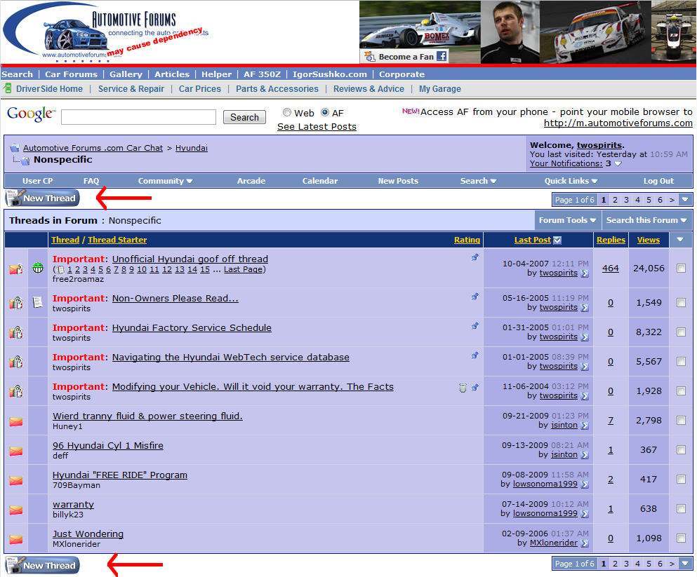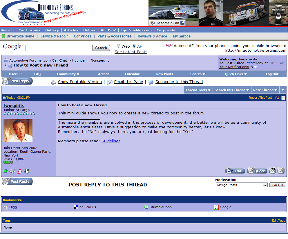 First, click on the Car Brand forum you want to post the thread. (in this example I will use Hyundai) ![]() At the Car Brand section, the models sub-forums will be shown. Click on the brand or sub category to view the threads within it. A new window appears showing the threads within that sub-forum. Here you would click on the New Thread button to create a new thread. The buttons are located at both the top and bottom of the window. ![]() The window refreshes and you are presented with the compose thread window. Here you will... 1-Enter the title of your thread. 2-Have the tools to format the message. 3-Able to insert smilies. 4-Compose your message 5-Give the thread unique tags which help in searches. 6-Give the thread an over all icon. 7-Submit the thread or 8-Preview it before submitting it to the forum. ![]() Once you click on the submit button, the screen refreshes and your new thread is posted to the forum. ![]() TS