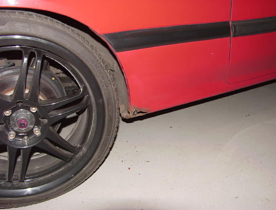 ok, here we have a civic with the common rusty rot hole in front of the rear wheel. We are going to repair the with no body work, very little money, and about 45 min to 1 hours worth of time. Not only will this cover up that hole, but add some protection to the quater panel.