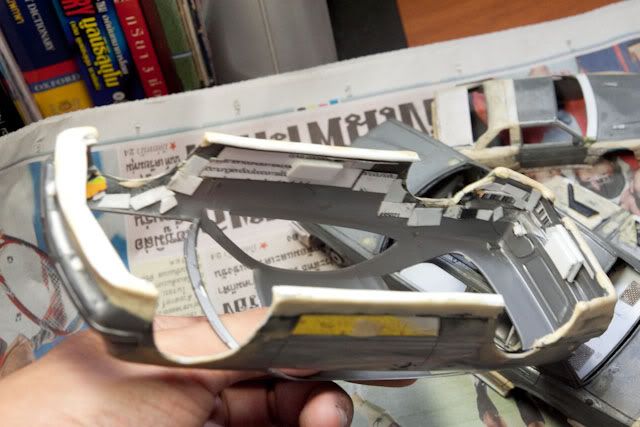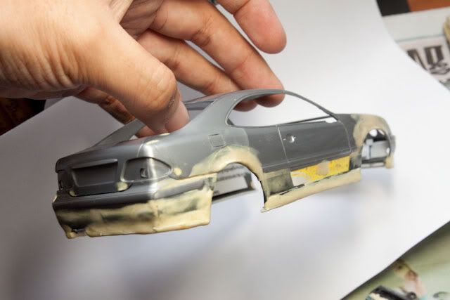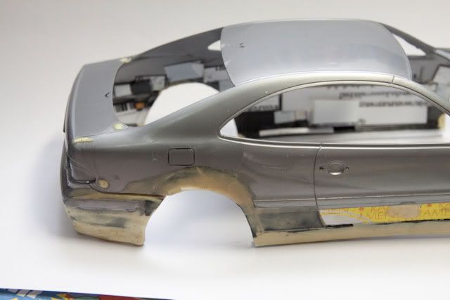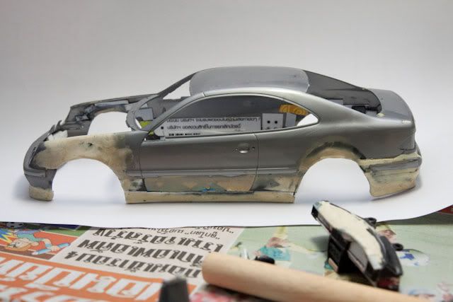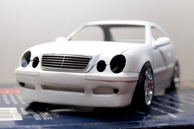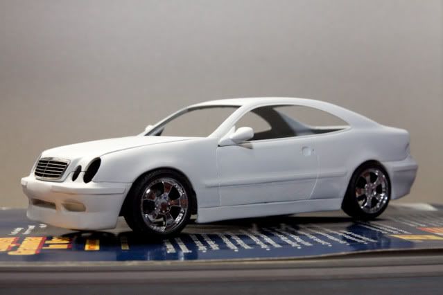 I planned to convert Tamiya DTM body to normal CLK 230 Kompressor. (not DTM-look street version like other) I used many spare parts from SLK Tamiya and S-Class W140 Tamiya. For chassis, I lengthened SLK floorplan since both CLK and SLK are based on C-Class W202 platform. (didn't take photos yet) and the body I cut fenders and bottom of W140 body to fit CLK body and reinforced with plastic card. Fuel door was rescribed. For the interior, I would skipped it since it is curbside model and I want to build it in VIP style with dark tinted window. I'd not to waste the time with almost invisible thing so I will let the space for accommodate lighting system instead.