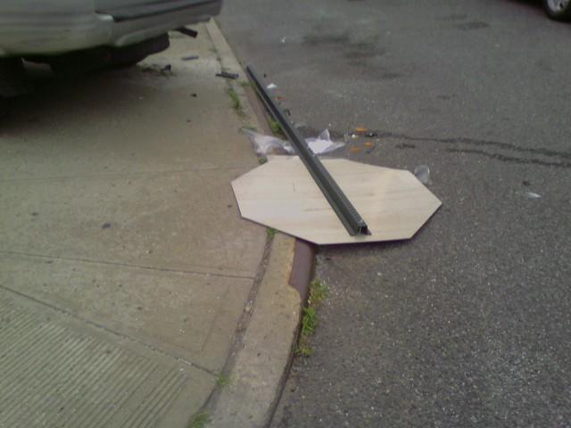 I predict another accident since the stop sign is no more. So we use the incredible do everything duct tape to put the stop sign back up. :lol: (Even though they are still flying through the intersection) and don't know if it would do any good. The DOT says it could take up till 14 days to respond to putting it back up. I am going to send these pics to the Commissioner and have them re-evalute their decision to put up stop signs instead of a traffic light.