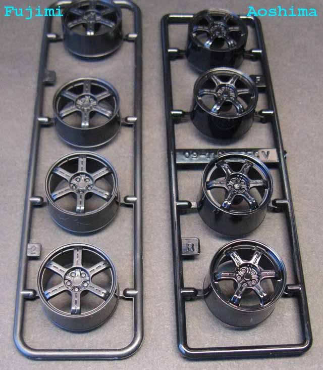 Both wheels look good, but in this picture, the Fujimi wheels look more crisply molded. That's because the Aoshima wheels come painted in gloss black. Fujimi wheels are approx. 1 scale inch larger for it's one of the Inch-up disc series kits. Aoshima wheels are more accurate in size, and they are compatible with Tamiya tires.