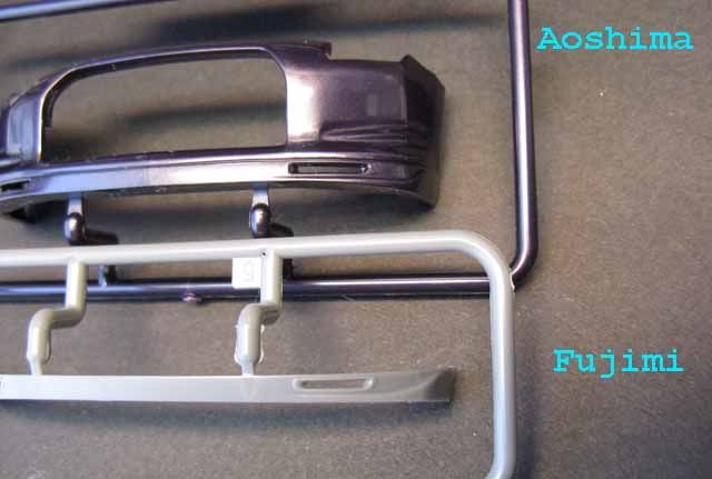 Fujimi's lip spoiler is separate as in the standard GT-R kit, while Aoshima has the spoiler molded with the front fascia. Both look good, but Fujimi's air inlet has a raised lip, which is clearly noticeable.