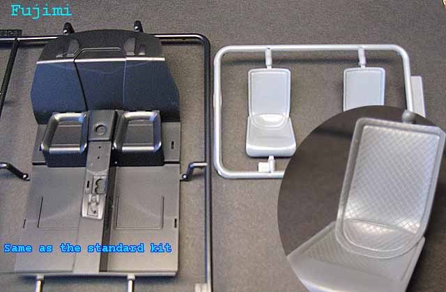 Fujimi's seat is three-piece assembly, and looks most accurate. Interesting feature of Fujimi interior is the separate center and backsupport in the rear. You can to add a gigantic amp and speakers, without removing the seat details on the kit part. ;)