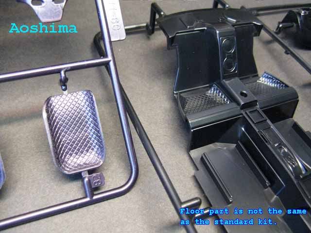 Tamiya's dashboard is least detailed, and the dimensions of the display and center control panel are inaccurate. The pedals don't have any details, because the separately-sold PE set does.